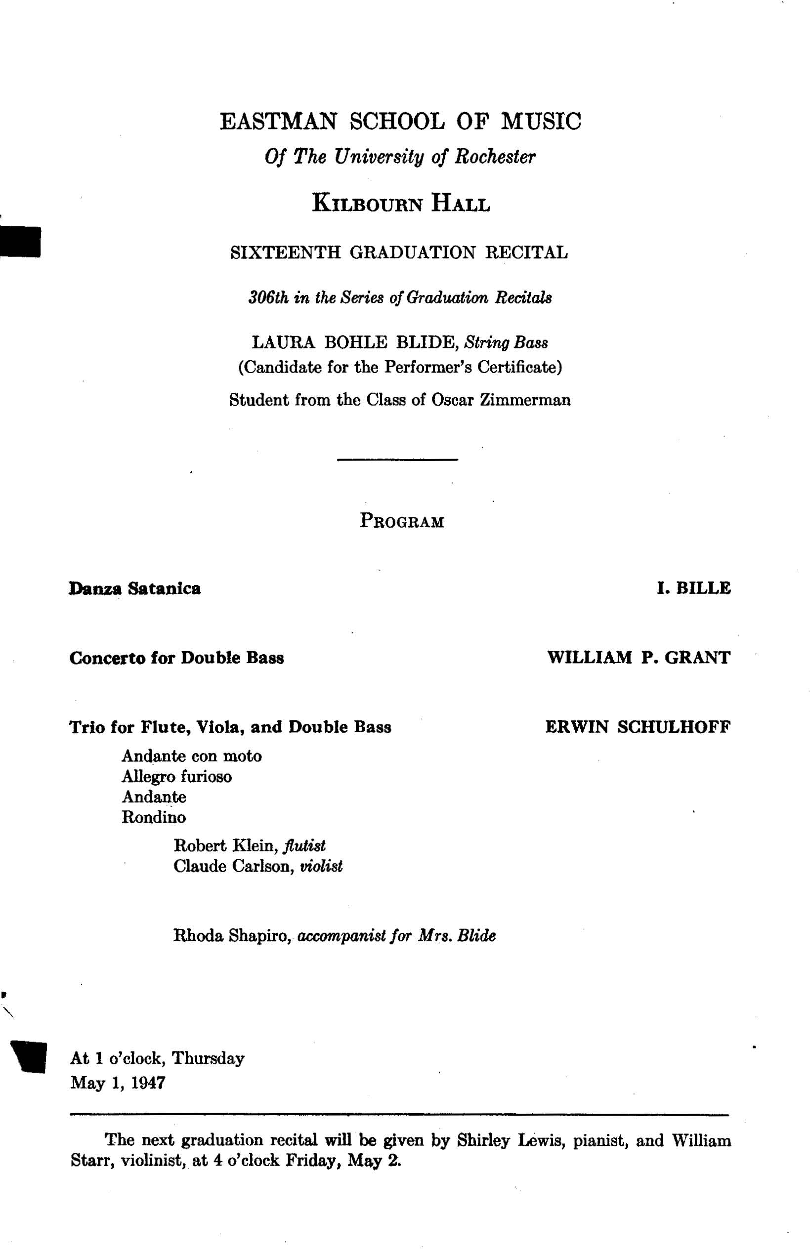 May 1, 1947 – Laura Bohle Blide, double bass, and Rhoda Shapiro, pianist, at Kilbourn Hall, Eastman School of Music, Rochester, NY. Premiere took place as a part of Ms. Bohle Bilde’s Graduation Recital – Program