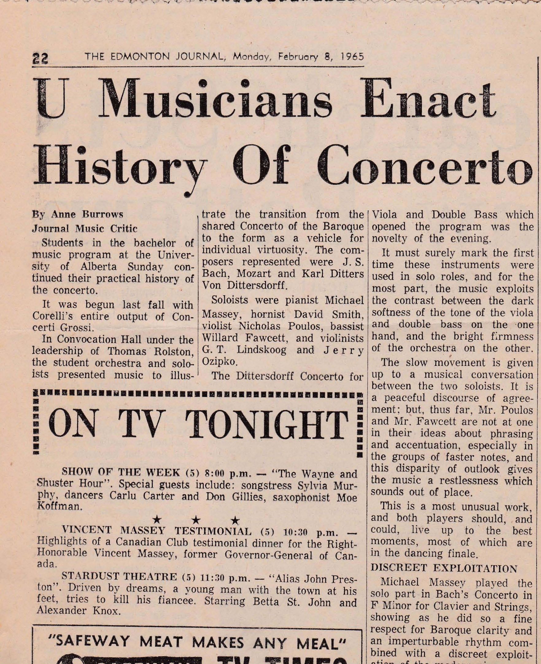 Burrows, Anne. “U Musicians Enact History of Concerto.” The Edmonton Journal 8 Feb. 1965: 22. Article Link