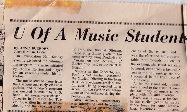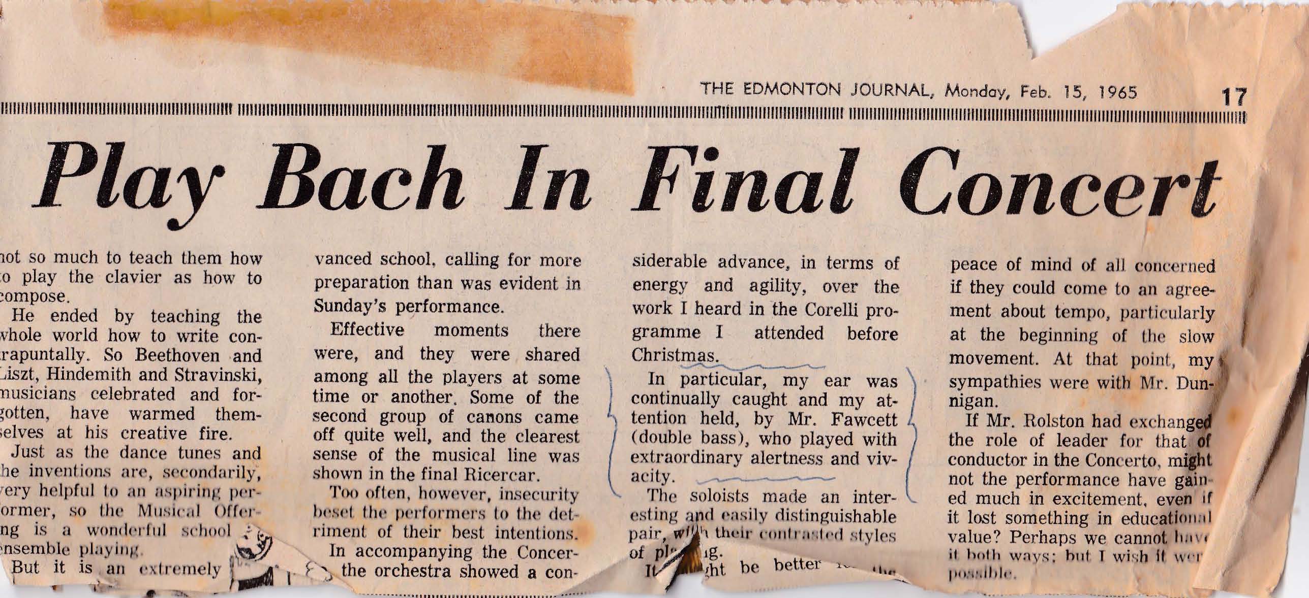 Burrows, Anne. “U of A Music Students Play Bach in Final Concert.” The Edmonton Journal 15 Feb. 1965: 16-17. Article Link 1 – Article Link 2