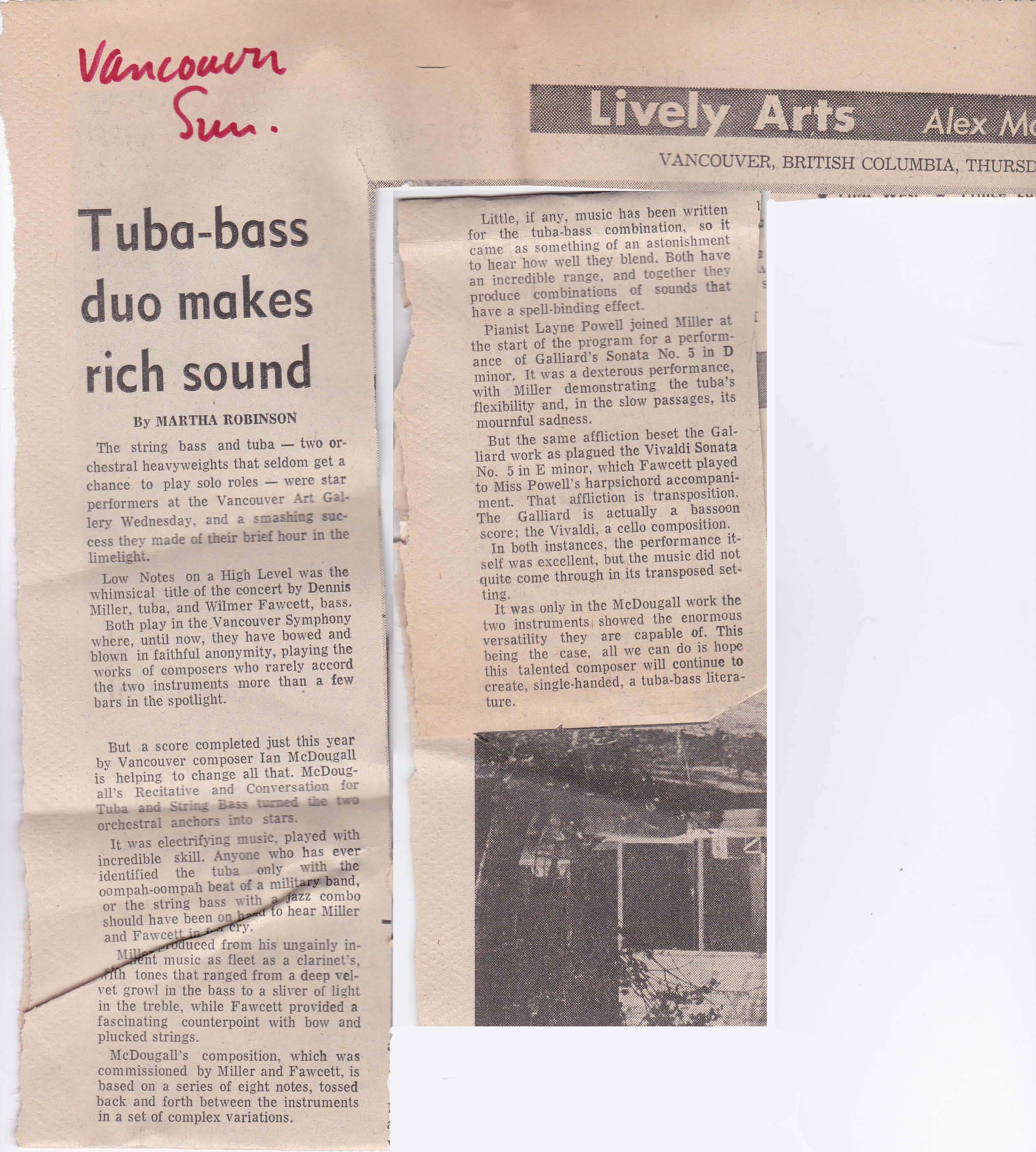Robinson, Martha. “Tuba-bass Duo Makes Rich Sound” Vancouver Sun 4 May 1972: pages unknown. Article Link