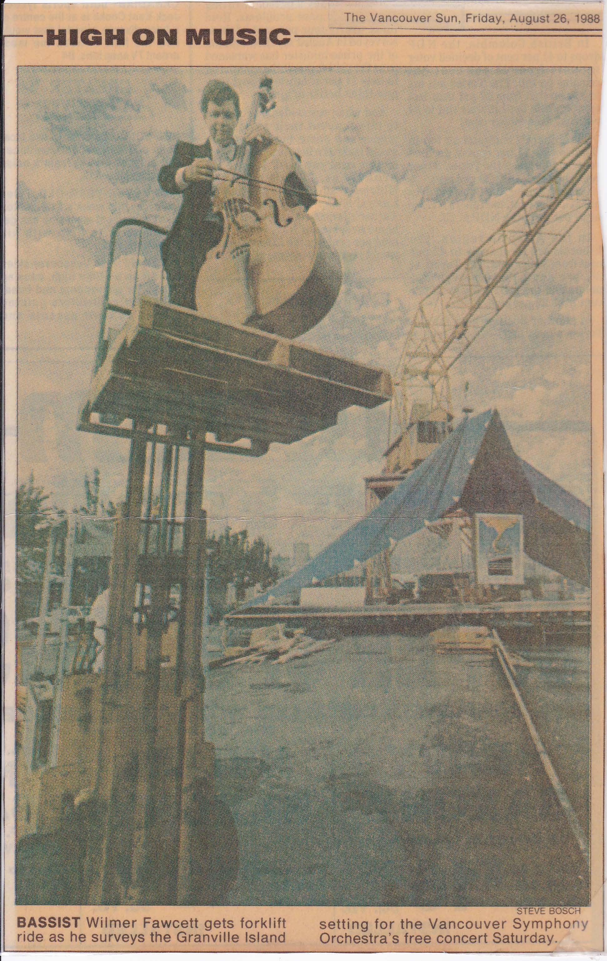 “The Vancouver Symphony had been bankrupt and shut down for a season. I had been invited to play a season with the National Arts Centre Orchestra in Ottawa. Upon my return, the VSO had become operational again, and they scheduled a special “back to work” concert in a tent under a massive crane on Granville Island in the heart of the city. As a publicity stunt for the concert, the newspaper asked me to play my bass on a forklift with the crane in the background.”