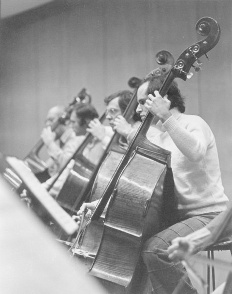 Vancouver Symphony Orchestra bass section. Early 70s. Ken Friedman, Wilmer Fawcett, Milan Hurt, Jim McKay. Image Link