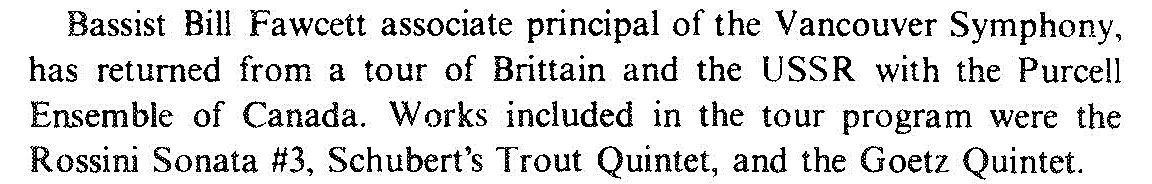 Broadcasted on November 18, 1983 ; CBC FM band ; CBC Vancouver Orchestra ; soloist Wilmer Fawcett on bass in Viennese Tuning ; orchestra leader Elizabeth Wilcock, as a concertmaster.