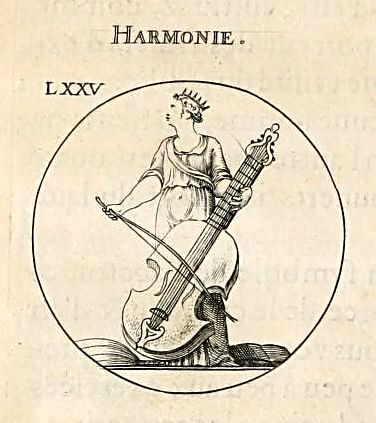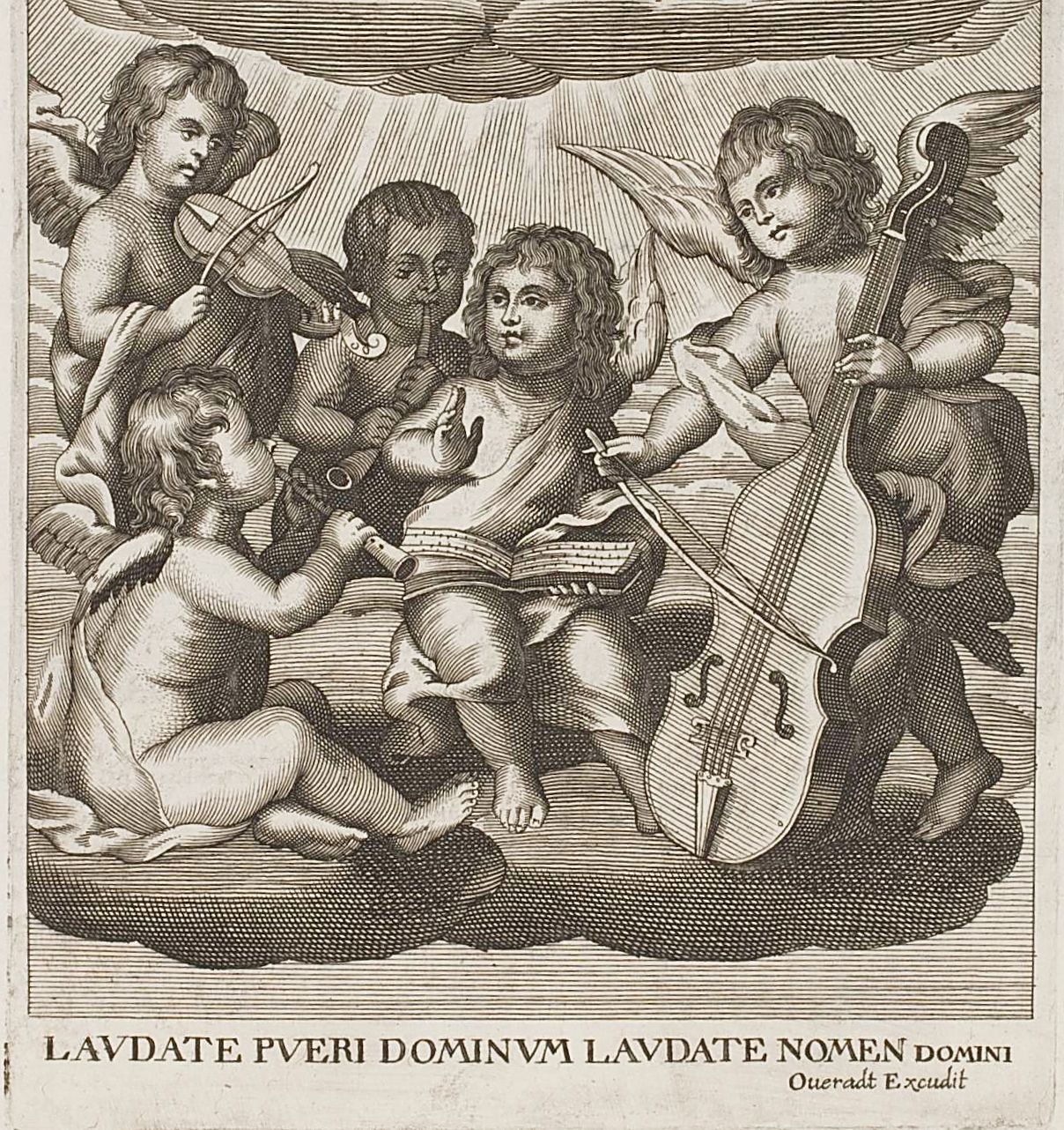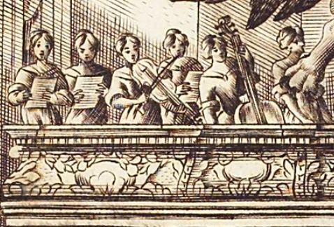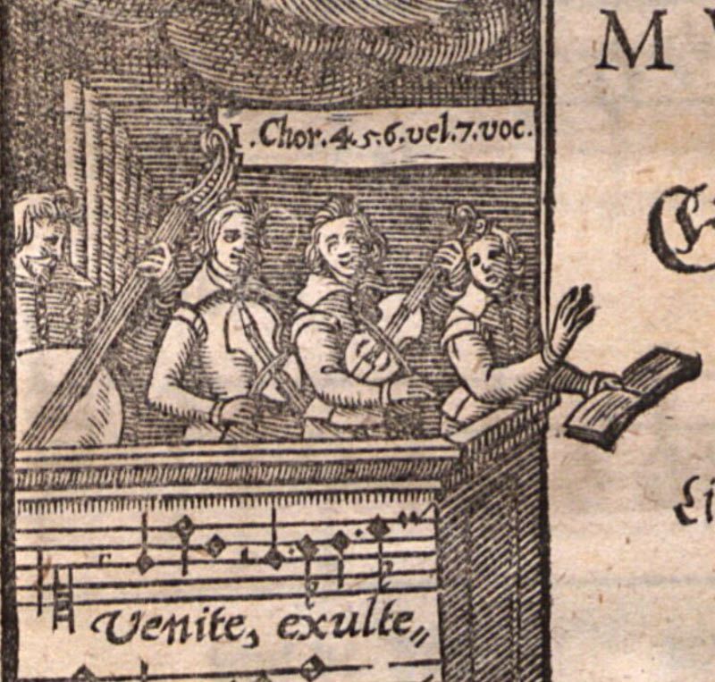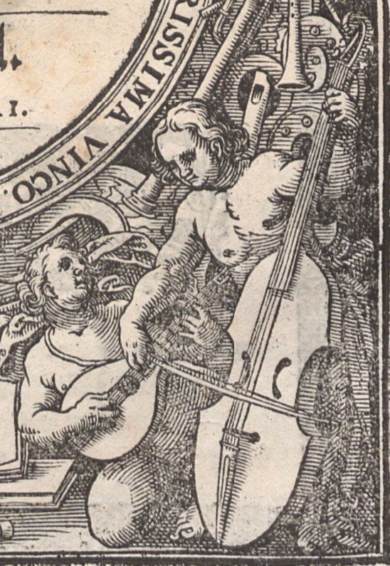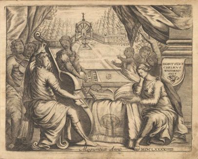 • The lovely engraving of a music ensemble with a bass instrument comes from the cover page of the Hortulus Chelicus, a compendium of violin pieces written by violinist Johann Jacob Walther who was active in Mainz at the time. The edition however, may have served several purposes: as a promotion for Walther’s compositional skills, as a didactic manual, and as a compendium of violin pieces for avocational musicians and nobility. Yet with all this considered, one may still puzzle why was a big bass fiddle presented so prominently, while the violins are barely visible in an edition that features solo violin pieces?
