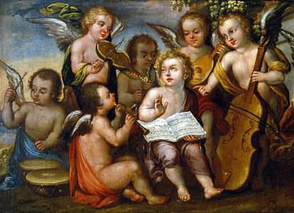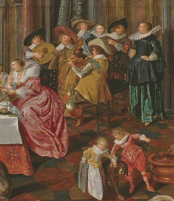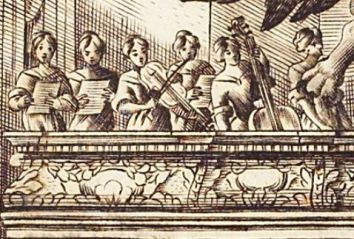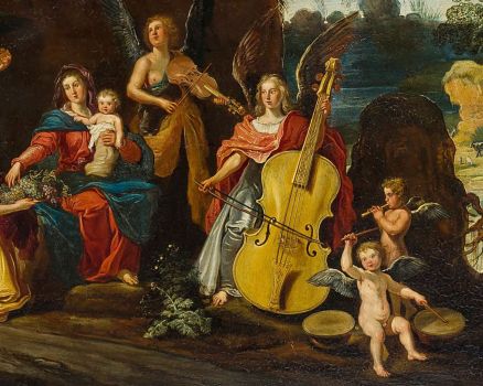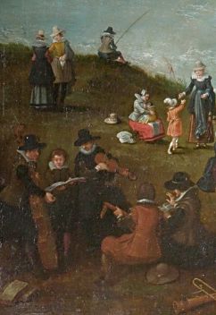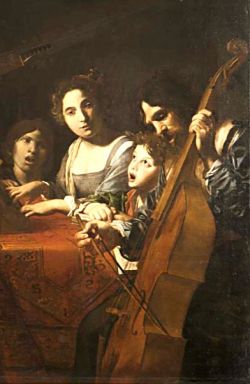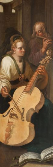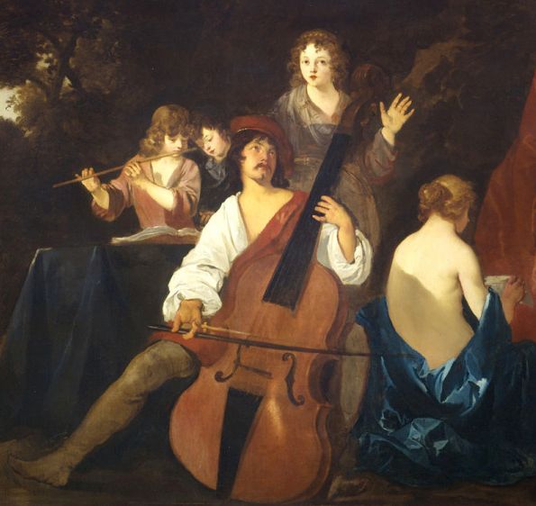 • Featured is a lovely image of four young musicians among whom one actually plays a double bass looking instrument, and which probably was not called so at the time this painting was created. What is interesting however is that the actual painting presents the performers and their instruments very much to the scale and which certainly could help in further evaluation of this instrument.