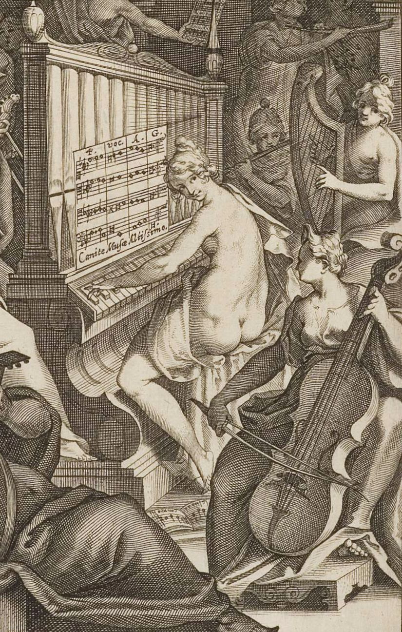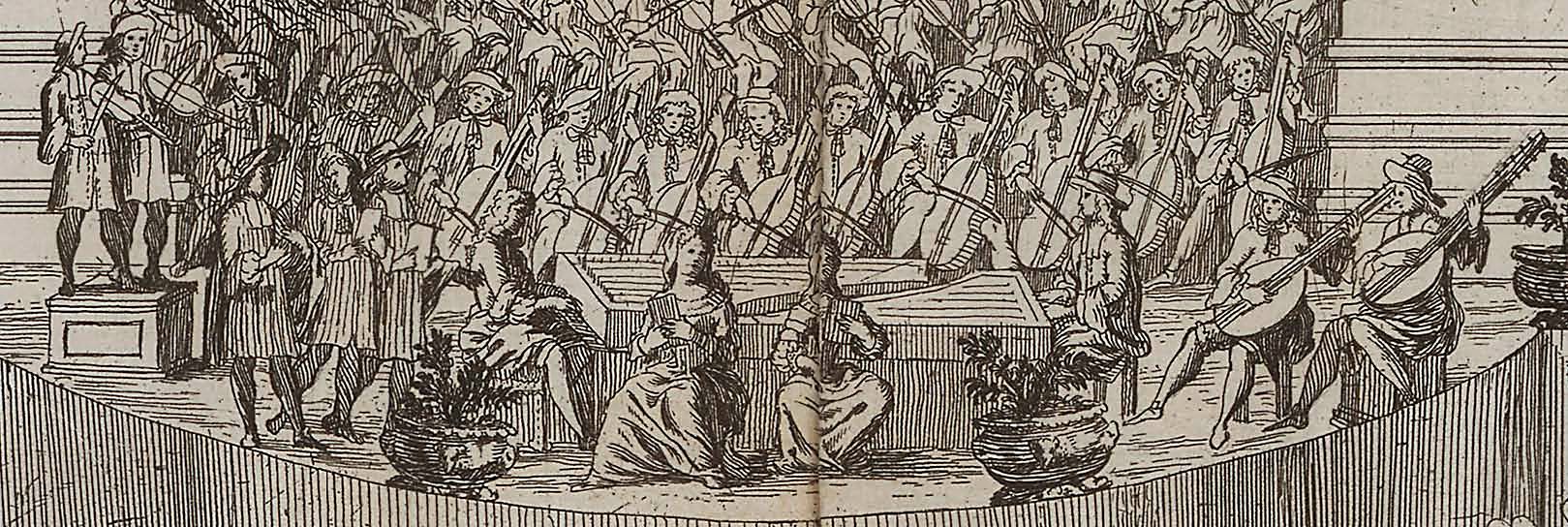 • Lastly a word about the dating. The print year on the score states 1694, yet the image shows 1695 in Latin numbers. This may imply that the entire edition was printed in 1695, unless the year presented in the engraving is a mistake? If you are curious about the text at the bottom of the image, it reads: “The Mogunitae Anno / MDCLXXXXIIIII” which means “In Maintz of Year 1695”. The very title Hortulus Chelicus could be translated as “The Little Garden of Fiddles,” so let us assume that one of them is also a bass fiddle, waiting in to be properly defined.