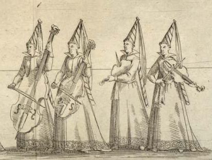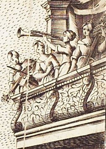 Dilich, Wilhelm. Musicians in Beschreibung und Abriß dero Ritterspiel, so der Durchleuchtige Hochgeborne Fürst und Herr, Herr Moritz, Landgraff zu Hessen etc. auff die Fürstliche Kindtauffen Frewlein Elisabethen und dann auch Herrn Moritzen des andern Landgrafen zu Hessen etc. am Fürstlichen Hoff zu Cassel angeordnet und halten lassen / Durch Wilhelm Dilich. Cassel: Gedruckt in Cassel durch Wilhelm Wessel. MDCL.(1601)