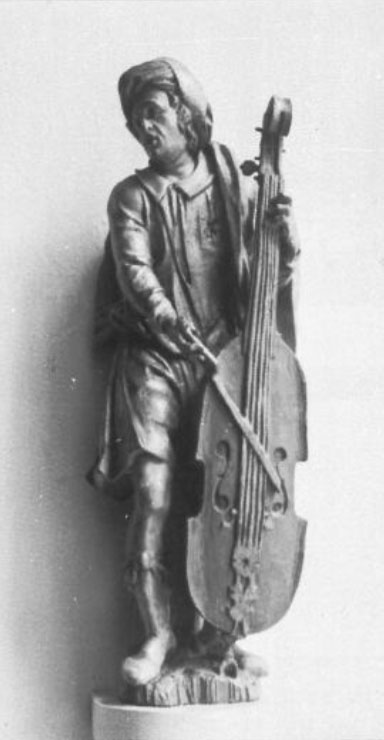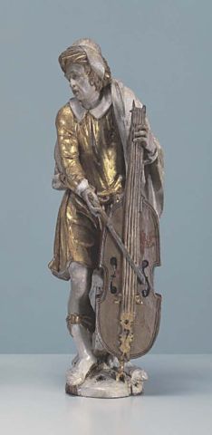 Anonymous. Upright Bass Player (from the series of Acht Musikanten – Eight Musicians). Basswood statue, ca. 1600, Braunschweig, Germany. Located at Herzog Anton Ulrich-Museum Braunschweig, Germany, id. Hol 16 – Hol 23.