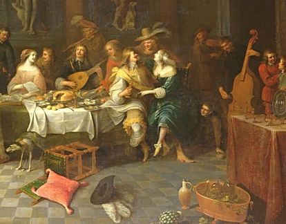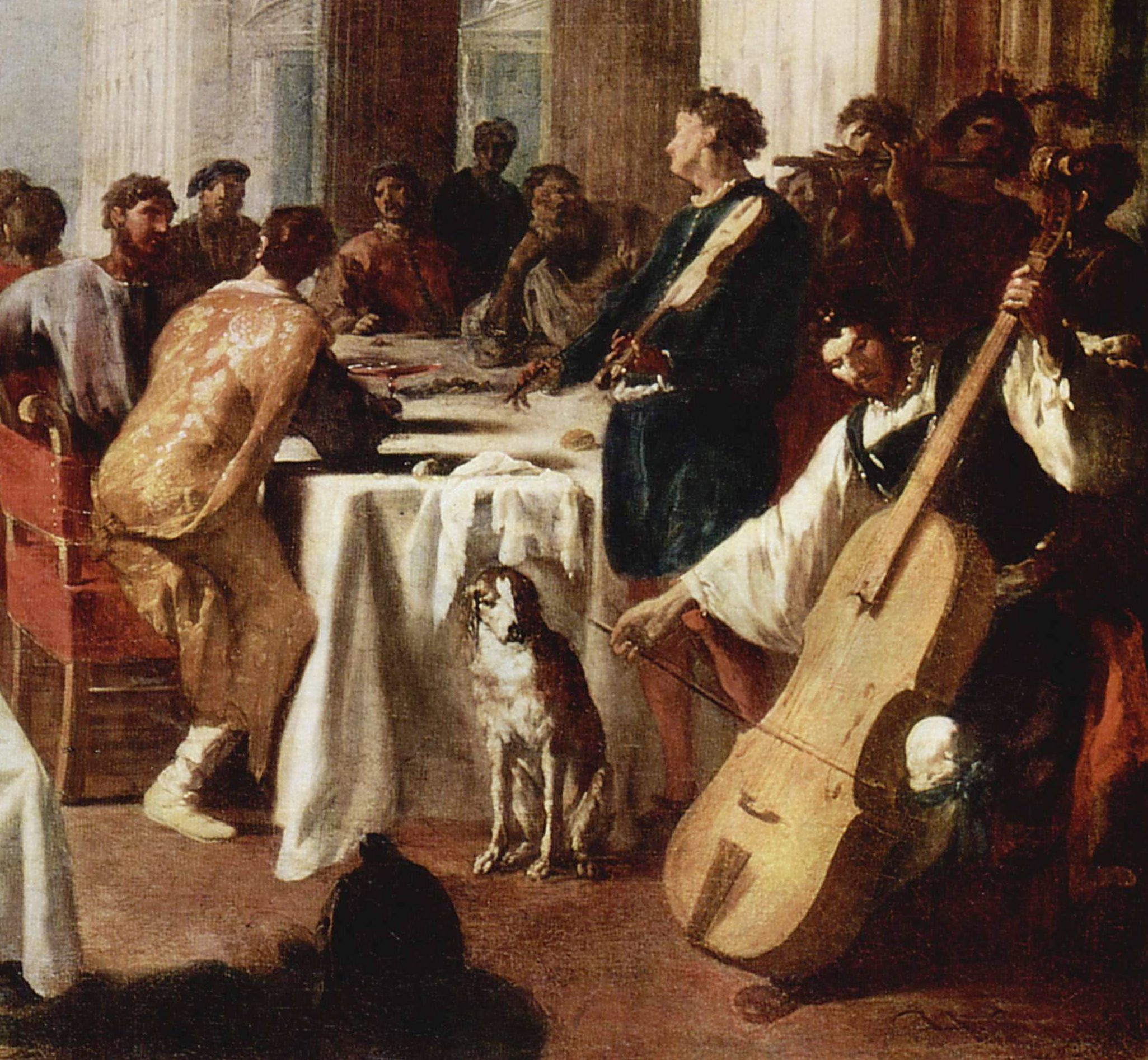 • Yet regardless, what we see is a Tafel Musik (table music) ensemble from the late 17th century where one of the instrumentalists plays a large bass fiddle in standing position. The bass instrument touches the ground by a small wood endpin while the scroll box shows some six pegs, indicating likely a six stringed instrument. The shape of this instrument appears to present a modified violin form, while the ribs appear of a relatively thinner profile and similar to the one at Anonym – Hailige Cacilie mit Engeln – 1685 . A curious detail is also a neck-end that seems to go a bit into the back plate.