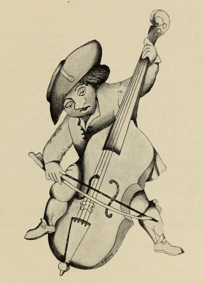 • On the other side, in the more recent scholarship, Planyavsky presents this image in two of his editions, but he titles it as contrabasso. The perception of the author of these lines however is that this instrument may be more a type of larger period Violone which is played in seated position, although in fact it may approximate by its dimensions a modern smaller ¾ sized double bass. Also, one can certainly note that the instrument rests on the ground while its scroll section appears to reach above everyone else in the room. If you wish for a reference of how a modern double bass would look with someone who holds it while seated in a common chair, please compare this image with the picture of a modern double bassist in such a chair. Photo Link (“Unidentified man with double bass,” 1890s, held by National Library of Scotland, Official Page – Nationalgalleries.com).